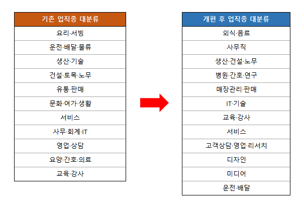 | 1. 전체 업직종 변경 2. 기존 대분류/중분류/소분류 3단계에서 대분류/중분류 2단계로 간소화 3. 기존 일자리와 이력서에 변경된 업직종이 포함되는 경우 개편 후 업직종으로 변경 |